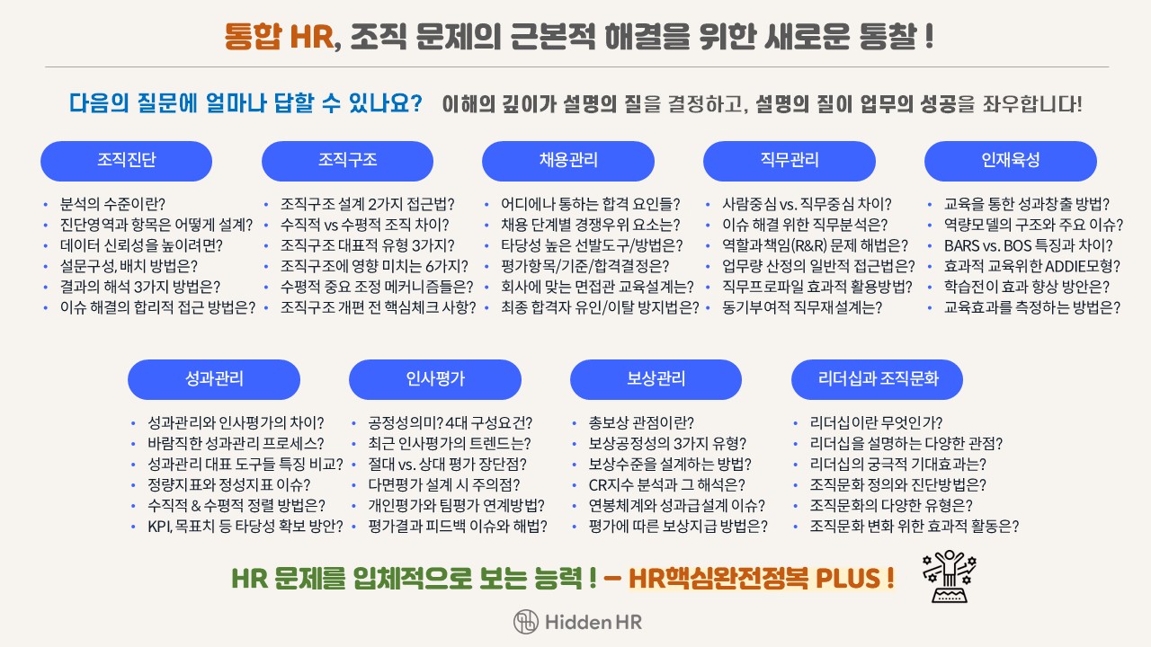 ์ฑ์ฉ,ํ๊ฐ,๋ณด์,๊ต์ก ๋ฑ ๊ฐ๋ณ ์์ญ์ ๋์ด, HR์ ๋ชจ๋ ์์๋ฅผ ํตํฉ์ ๊ด์ ์์ ์ ๊ทผํด์ผ ํฉ๋๋ค.